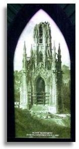 The soaring, Gothic monument to the memory of Sir Walter Scott was built in 1840-46 to a design by George Meikle Kemp, a self-taught architect. In the competition to design the monument, Kemp initially came third, but embellished his design to win (though professional architects were not amused). It was influenced by Melrose Abbey but nowadays looks more like a space rocket, ready to blast off from Princes Street Gardens. The architect had met Scott in 1813 when the author, who was also the Sheriff of Selkirkshire, gave him a lift in his carriage. Kemp entered the competition as "John Morvo" who was a medieval master mason at Melrose Abbey. But he never saw his ideas come to fruition - he tripped into the Union Canal in a fog in 1844 and drowned. The picture here shows the monument under construction in the early days of photography