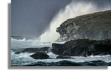 Graphic by Andy Waddington, via Wikimedia CommonsWinter can be a frightful time at Eshaness lighthouse. Violent storms come in from the west and batter the solid three-foot walls of my lighthouse home. Charles and David A Stevenson in 1929 built the little house and its square tower to withstand the ocean's fury. The ocean side has thick wood shutters on all windows. When a storm is forecast all shutters must be bolted and everything tied down or it will be gone. This year we lost an old television antenna which Tom Williamson, our caretaker, later found in the front yard. The graphic on the right by Mike Pennington, via Wikimedia Commons, is of a storm battering the coast of Shetland.