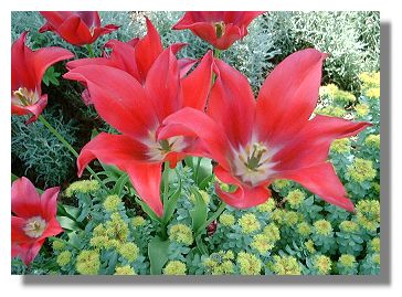 These red tulips were almost past their best in a border of the gardens of Finlaystone House in Inverclyde. The photo was taken in the month of May in 2001 when thyere were above average temperatures and as a result some flowers did not last as long as usual.