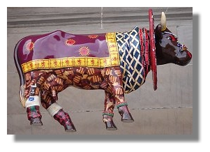 A herd of brightly painted life-size cows has been stampeding through the centre of Edinburgh recently, as 100 model cows, painted in a variety of designs by local artists, can be seen chewing the cud in streets, parks and landmarks. CowParade is billed as the world's biggest touring public art event and will run in Edinburgh to 23 July. After the event, the cows will be auctioned, with 75% of the proceeds going to charity. The fibreglass sculptures are largely of a set design with different artistic ideas painted on them - there are saltires, a glow-in-the dark "Night Moo on Blair Street" and bus routes to such places as Moorayfield, Morninghide and Portobullo. But there is also a "Three Grazers" by "Antonio Coonova" (see below) outside the Scottish National Gallery, alluding to Canova's sculpture of three women entitled the "The Three Graces" inside the gallery. There is no doubt that the sculptures are proving to be a hit with tourists, especially the kids. Their humour has also produced a lot of smiles! A special moo-mento of CowParade Edinburgh has been produced. See also www.cowparade-edinburgh.co.uk.