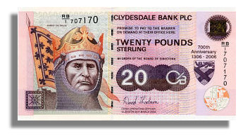 King Robert the Bruce seized the Scottish crown in March 1306 and during the year there have been events marking that important date. But it took the Clydesdale Bank to the end of December to bring out a special edition of their £20 bank note as a tribute - though better late than never. King Robert I has adorned that denomination of Clydesdale banknote for many years and the design has been modified with the inclusion of Bruce's original heraldic shield (with the permission of Lord Elgin, the 37th chief of the Bruce clan and a bloodline descendant of the king). The reverse of the note also has the addition of words marking the 700th anniversary of Bruce's enthronement, on 25 March 1306.