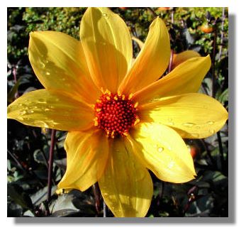 The dahlia shown here in the sunshine shows the raindrops from a recent shower of rain.