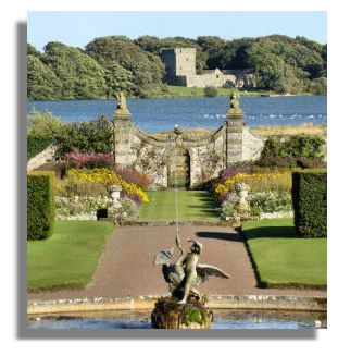 The illustration is of Kinross house Gardens, with Loch Leven and its castle in the distance.