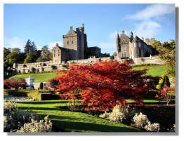 This week's large format photographs taken in Scotland to show the current season and its flora and fauna include the autumn leaves of a fiery acer tree in front of Drummond Castle in Perthshire (see thumbnail); brilliant white petals of Eucryphia; bright red hips of Rosa Rugosa; a fearsome Crocodile beside an ornamental pond at Drummond Castle; the showy, intensely bright flowers of Nasturtium; purple Colchicum, the "Autumn Crocus".