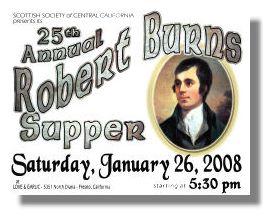 The Scottish Society of Central California is holding its annual Burns Supper on January 26th, 2008 at Love and Garlic, North Diana Court, Fresno, California. Hear about Scotland's bard from Dr Neil McLeod and the entertainment will be headlined by the Browne Sisters and George Cavanaugh. Music will be provided by the Fresno Stag and Thistle Pipe Band. "Harps at Play" and Hannah Tarrant's Fresno Highland Dancers will also keep the feet tapping. For more details, see Scottish Society of Central California.