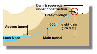 15 months ago, a 220-metre (720 feet) long boring machine - dubbed Eliza Jane - began to cut through the rock above Loch Ness to create a tunnel as part of a £140 million hydro-electric scheme. This week the engineers were celebrating as the machine broke through at the other end of the five mile long tunnel at Glendoe, near Fort William. When complete, the system will generate up to 100 megawatts of electricity. A new dam is being built at the head of Glen Tarff on the western edge of the Monadhliath Mountains, east of Fort Augustus. A system of tunnels will take the water to a generating station buried in the rock 2,000 feet below. It is the first large-scale hydro-electric project in Scotland since 1957.