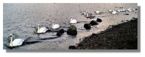 The illustration above shows 16 hungry swans in line astern - pursuing the photographer because he was carrying a plastic bag - a sure sign that bread might be thrown to them!