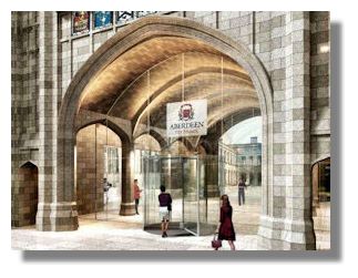 New architects' impressions have been published this week of what the redeveloped Marischal College in Aberdeen will look like. The historic building is the second largest granite structure in the world and is to be transformed into Aberdeen City Council’s new corporate headquarters. The images show the archway to the courtyard converted into the new main entrance to the council HQ (seen here), a remodeled and re-landscaped courtyard, and an internal perspective of the proposed reception area. The plans include the demolition of the present interior and its replacement by a 21st century office building, providing 17,000 square metres (183,000 square feet) of modern office space on four floors for up to 1,300 city council staff. All the present granite elevations will be preserved.