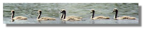 The illustration above is of a family of six young cygnets in (more or less) line astern formation. The youngsters are growing up fast!