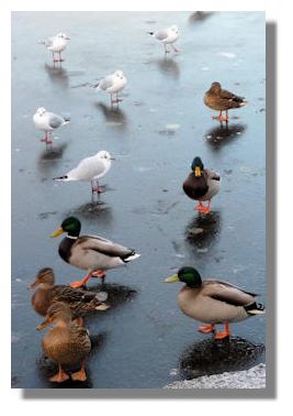 The mallards and seagulls in this picture are walking on ice on a loch near Glasgow.
