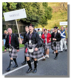 The armorial bearings of the different branches of Moffat seem to indicate a connection with the church. Robert the Bruce, as Lord of Annandale, granted four charters of land in the Barony of Westerkirk to the Moffats in 1300. They had a long feud with the neighbouring Clan Johnstone who were another Scottish border family. The feud climaxed in 1557 with the murder of the Clan Moffat chief and the most important members of the Moffat family. Clan Moffat was almost wiped out. Seventy years later, all of the Moffats' lands were passed to the Johnstones due to the Moffats having massive debts. The graphic here is of the Moffats at the Clan Gathering in Edinburgh in 2009. For more on the Moffat family history seeScottish Clans - Moffat