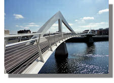 Tradeston Bridge, known locally as the "Squiggly Bridge" is a pedestrian bridge across the river Clyde between the international financial centre in Anderston on the north bank and Tradeston on the south bank to aid the regeneration of the more prosperous district with its large office blocks. The span is curved in an S shape which prompted its nickname. See: Glasgow Photo Library - Squiggly Bridge