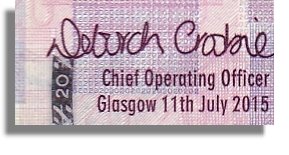 The appointment of a female chief operating officer in the Clydesdale Bank has meant that she is the first female signature on the face of a Scottish Banknote. See: Historic Scottish Banknote