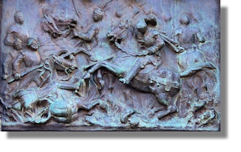 I have passed the imposing statue of the 5th Duke of Buccleuch in Edinburgh's Parliament Square, in front of St Giles Cathedral, on many occasions. But like many folk who pass by, I had not stopped to look in detail at the two rows of bronze reliefs which encircle the tall base. The lowest tier illustrates episodes in early Scott family history, many showing violent battles with invading English armies. Another tier has scenes from the Duke's life and allegorical figures at the corners. The Clan Scott Scotland Web site photo gallery has illustrations of all the panels at 5th Duke of Buccleuch Statue