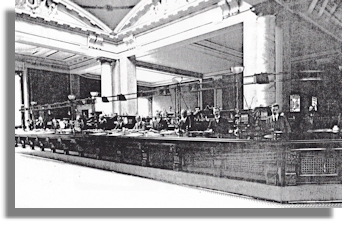 The picture here is of the bank cashiers (tellers) on the front counter in the 1920s. By the 1950s there were fewer staff and after World War II there were also lady cashiers. They were paid less than the men, in part because all male staff were expected to study for professional banking qualifications. Girls recruited to the bank even in the 1950s and 1960s were positively discouraged from taking the exams - no senior executives (all men) in those days would have dreamt of having a female branch manager!