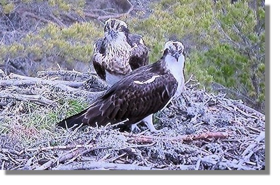 The female osprey known as "EJ" from the identity ring on her leg has been to Loch Garten for 15 years and has fledged 25 chicks with her current partner known as "Odin" and other males.Having fattened up on the fish in West Africa they will be plunging into the colder waters at Loch Garten and other lochs and rivers to feed their latest family.