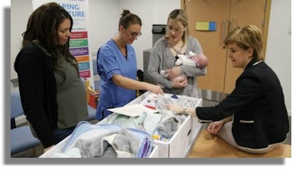 1 January was 'Baby Box Day' in parts of Scotland with baby boxes being dished out by Nicola Sturgeon, Scotland's First Minister, in a photo-opportunity friendly environment to some mothers of newly borns. The graphic of the First Minister meeting midwives, new mothers and expectant mothers at the launch of the pilot scheme is courtesy of the Scottish Government.