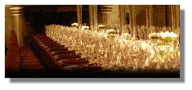 We were then invited to move through to dinner within the candlelit Great Hall with its barrel vaulted ceiling, open hearth and thick stone walls. The long table was beautifully laid with crystal glasses, silverware and flowers. For house parties, weddings and events, all catering is by Heritage Portfolio which provides the chefs and waiting staff. (Up to 84 can be accommodated in the Hall for dinner). Our menu this evening began with Grilled baby goat's cheese salad, then Baked Monkfish, pak choi and nicoise potatoes finishing with Scottish summer berries, shortbread and limoncello ice-cream, coffee and petit fours. Wines which accompanied the meal were a French Loire Sancerre and New Zealand Pinot Noir. A glamorous banquet in such an historic setting.