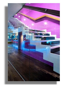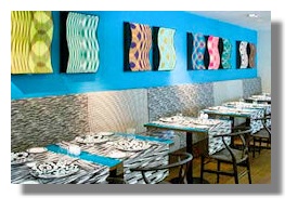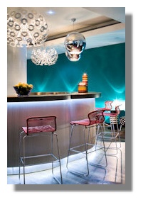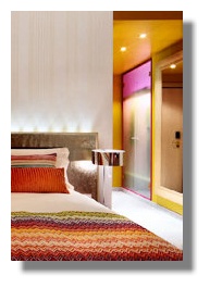 Bedroom design is not only fashionable but also functional for the 21st century traveler. Expect a riot of bright, bold colours: turquoise, purple, olive green, with co-ordinating arm chairs, the whole rainbow effect softened with off-white papered walls and ceiling. While it may sound like a giant box of Liquorice Allsorts, the concept behind the interior design is an artistic masterpiece of contemporary glamour, where fashion is not just about what you wear but a total lifestyle: sleep under a Missoni duvet and patterned throw and sip freshly brewed Espresso coffee in a b & w Missoni cup. A sliding mirrored door leads into the shiny purple shower-room featuring monsoon power shower, mosaic tiles, heated floor, a neat row of multicoloured soaps and luxury Missoni scented toiletries, a pile of soft towels and gorgeous Missoni towelling bathrobes.A striped rug covers the polished wood floor; a LCD TV sits on the desk/dressing table (currently lacking the essential make up mirror but due to be added soon). Homely comforts include wifi Internet (laptops available to borrow) and a mini bar filled water, fresh milk, fruit juice and beer. The good news? Mini bar drinks are complimentary, part of an "allinc" room tariff, (from £ 210 per night) which includes breakfast, free local calls, internet access, TV movies and laundry (two items). You might be tempted to take away the classy coffee cups, but perhaps better to purchase these, and a bathrobe, towel or T-shirt at the Hotel shop!
