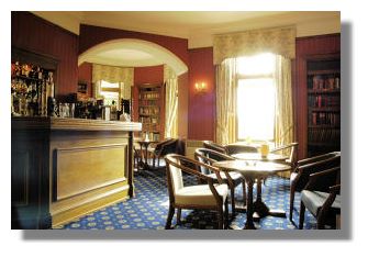 The entrance to the front hall is up a short flight of stairs where at a neat reception desk you will be greeted by one of a small friendly team of staff. The General Manager, Chris Marsh, has been at Castle Venlaw for several years. To the immediate left along the corridor is the cosy Library bar (see illustration), where a log fire will be burning daytime and evening in the colder months of the year. Next door is the elegant dining room, featuring a decorated ceiling, handsome fireplace and neat placing of tables around the room. The Adam Room featuring original architectural features of the Georgian house is used for wedding ceremonies, private dinners and receptions. Upstairs over three floors are twelve very individually designed bedrooms and suites.