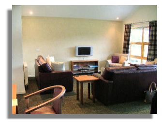 My partner Ken and I were allocated a single storey lodge in the front row, with uninterrupted views across the lawn and field down to the Loch. Our temporary home has two en suite double bedrooms (beds can be twin or double), spacious, homely, living room with dining table and a small kitchen. It is all beautifully designed with high end, immaculate quality furnishings such as two burgundy brown leather sofas (one is a double sofa bed), two oatmeal and purple checked tweed armchairs, lush curtains, flat screen TV (11 digital/ sky channels) and DVD/ CD player. The walls have an attractive selection of landscape prints by Pam Carter. Lighting from spot lights can be dimmed and there's even a remote to turn on the standard lamp.