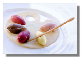 After a breather, it was pudding time. The Sorbet (see picture) looked magnificent but Hot Fondant of Chocolate with Caramelised Milk Ice Cream got my vote, while husband had cheese and walnut oil bread. Coffee and petit fours were served in the lounge, where we chatted to the other guests till midnight, when Pam and Brian swished in to clear up. Although they didn't drop hints that it may just be time for us all to beetle off to bed, the message got through…..