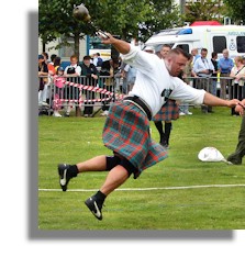 Tossing the caber and other heavyweight attractions please crowds, along with the usual mix of piping, dancing and races. The royal connection adds a cachet at Balmoral, one of the most prestigious of the events. The graphic shows a contestant throwing a heavy weight or "putting the shot" at a Highland Games.