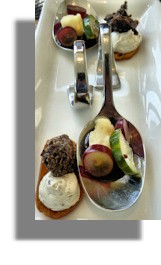We were surprised right at the start when some amuse-bouche arrived on biscuits and special spoons. These are single, bite-sized hors d’œuvre with intense flavours not ordered from a menu by patrons, but, when served, are done so free and according to the chef's selection. According to Wikipedia, they are served both to prepare the guest for the meal and to offer a glimpse into the chef's approach to the art of cuisine. A nice touch - and apparently a de rigueur offering at Michelin Guide-starred restaurants and those aspiring to that category.