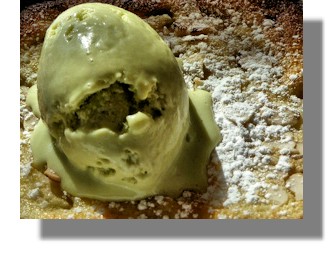 I finished up with three excellent cheeses from the well-stocked trolley. I was somewhat surprised and pleased that the cheese course did not attract a supplement to our fixed price (£28.50) lunch. Scottie transported to a sort of catatonic but pleasant pudding-induced trance with his pistachio ice-cream served over a "Pear Clafoutis" (a kind of crème brulée, which had a little pieces of pear as a sort of bonus ball.