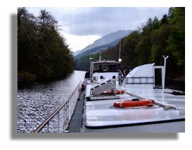 Every day, morning or afternoon, there's at least four hours of "sailing", when you can relax in the lounge, (library of books, newspapers and CD player), sit on the sun deck with binoculars to spot birds, flora and fauna, or join the Skipper in the Wheelhouse - (except during a difficult navigation in or out of a lock). We continue through the peaceful Loch Lochy surrounded by birch woodland, before entering the manmade canal again through the Laggan lock. It's fascinating watching the lock-keepers at work, opening the sluices to raise (or lower) the water level and we move forward through the next gate. Alongside our very long barge, the canal traffic in the locks is occasionally chockablock with several motor cruisers and yachts and we wave a greeting in common nautical language. As we motor on towards Loch Oich, Skipper Dan alerts us to come on deck to see Laggan Avenue, a tranquil, meandering, curving canal framed by a woodland of tall, slender Scots Pine.