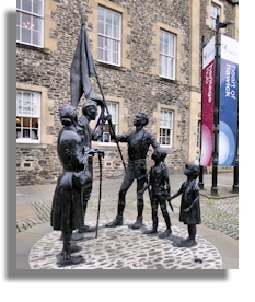 Hawick is known for its yearly Common Riding and also for statues to the Battle of Hornshole fought in 1514 (the year after a major defeat of the Scottish army at Flodden) between youths from Hawick and an English raiding party. ("The Horse" shown at the top of this page, was erected in 1914 to commemorate the victory and the sculpture pictured on the right is a more recent one beside a museum (Heart of Hawick) created inside Drumlanrig's Tower, which dates largely from the mid-16th century. The two statues celebrate the capture of the English Flag by the youth of Hawick at a place called Hornshole.Long after they ceased to be essential, the ridings continued in commemoration of local legend, history and tradition. The Hawick Common-Riding is the first of these Borders festivals.