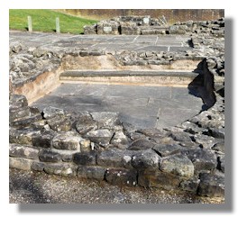 Also in Bearsden, in a local cemetery, part of the base of the wall has been uncovered and is looked after by Historic Scotland. A few miles east of Bearsden, at Bar Hill, not far from the village of Twechar, is another well defined fort and bath house, with commanding views over the valley of the river Kelvin to the Campsie Hills -see artist's impression on the right of what one of the buildings there would have looked like. A number of the artefacts, including five altars which were dug up here are on show in the Hunterian Museum in Glasgow