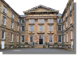 A sculptured stone representation of the Buccleuch sun and crescent moons crest is on the front of the building.