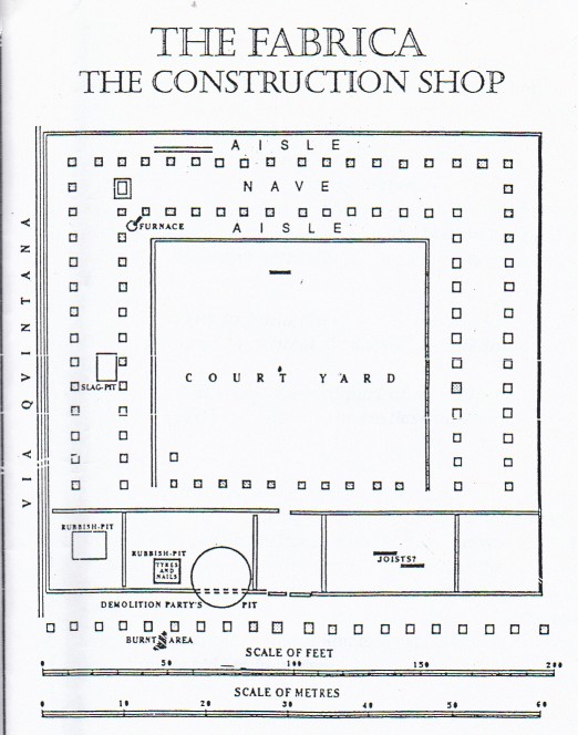 Totally self sufficient, Inchtuthil could house, feed and train a complete Roman legion. ("SPQR" Senatus Populusque Romanus meaning "The Senate and the People of Rome"). It is thought that the XXth legion was based at Inchtuthil. They had their own 64 ward hospital, six granaries, all weather indoor and cavalry training schools, centurions houses and barrack blocks, baths, stabling for over 1,000 horses and mules and the all important fabrica. The fabrica was a huge building covering an area approximately half the size of a football pitch and was a Roman metalwork factory. As well as arms and armour, the blacksmiths produced everyday metalwork for the fort - door latches, horseshoes, and iron nails. See plan of the Fabrica below: