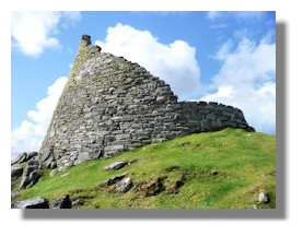 A Broch is an Iron Age drystone hollow-walled structure of a type found only in Scotland. They include some of the most sophisticated examples of drystone architecture ever created. The theory that they were defensive military structures is not accepted by many modern archaeologists but the alternative notion that they were farmhouses is ridiculed by others.The broch at Dun Carloway on Lewis is remarkably well preserved - parts of the original wall still reach as high as 9 metres (nearly 30 feet) tall. Dun Carloway was probably built some time in the 1st century BC, and radiocarbon dating evidence shows that it was last occupied around 1300 AD.