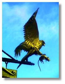 During restoration, painted ceilings were uncovered and the arcade frontage providing shelter for the customers (typical of the shop frontages popular in the 17th century) has been restored. Typical of Edinburgh buildings of its day, it rises to six stories. Various floors in the building would have been rented out by Thomas Gledstones. "Gled" is the Scots word for a hawk, which explains the (modern) hanging sign outside the building which has the date 1617 surmounted by a gilt-copper hawk with outstretched wings (see above).