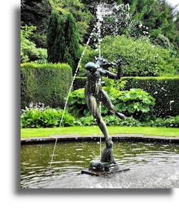 One of the delights of Greenbank Garden is that as you wander round the various elements of the layout, you can hear the sound of a fountain - sometimes close at hand, sometimes at a distance. Because of the hedges and division of the garden into smaller sections, it is a minor challenge to actually find your way to the where the water is falling from the fountain.The statue which forms the fountain is named "Foam" and is a green, female water nymph. The fountain was created by Charles d'Orville Pilkington Jackson (1887-1973) for the Empire Exhibition in 1938. His family gave the fountain to the National Trust for Scotland in the 1980s and the pond was made for it at Greenbank. It has only left the garden once since then, to appear in the Glasgow Garden Festival in 1988. Pilkington Jackson also sculpted the impressive statue of Robert the Bruce at Bannockburn (which was recently renovated in anticipation of the celebration of the 700th anniversary of the battle next year.
