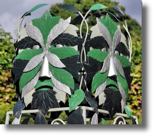 The National Trust for Scotland celebrated the 250th anniversary of the building of Greenbank House itself during 2013. A lot of renovation work on the garden was carried out in anticipation of this anniversary and a large number of events took place during the year. In addition, a striking metal sculpture was erected representing a "Green Man" - a decoration referred to in works on architecture as "foliate heads or foliate masks". It is thought that the motif goes back to Pagan times and carvings of the Green Man may take many forms, naturalistic or decorative. The simplest depict a man's face peering out of dense foliage. Some may have leaves for hair, perhaps with a leafy beard. There is a Green Man carved high on the front wall of the 250-year-old Greenbank House and a local metal worker took this as the starting point for this Green Man metal sculpture to mark the anniversary.