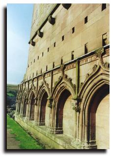 Despite the centuries of neglect, there are soaring, decorated arches, vaulted ceilings, elegant tracery on the south transept and many carvings (some of which are humorous - like the pig playing the bagpipes and the grumpy fellow bearing the inscription "He suffered because he himself willed it"). And Robert the Bruce's heart>, reburied on 24 June 1996 (the anniversary of Bruce's victory at Bannockburn in 1314) now has a plaque with an inscription from Barbour's "The Brus" reading "A noble hart may have no ease, gif freedom failye" Translated, this means "A noble heart cannot be at peace if freedom is lacking" It incorporates a carving of a heart entwined in the Saltire, the basis of Scotland's national flag.