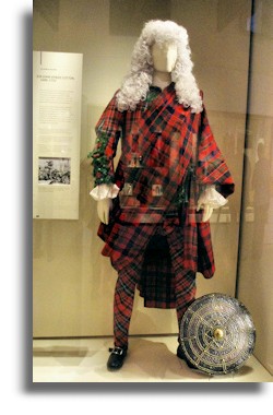 This striking tartan outfit, including the Highland targe or shield, belonged to Sir John Hynde Cotton of Maddingley Hall in Cambridgeshire. He lived from 1686 to 1752 and was a prominent English Jacobite. In 1744 he visited Edinburgh and was granted the freedom of the city. He has been called "one of the most zealous Jacobites in England". Prime Minister Horace Walpole wrote that Cotton "had wit and the faithful attendant of wit, ill nature; and was the greatest master of the arts of the House of Commons, where he seldom made but short speeches, having a stammering in his elocution, which however he knew how to manage with humour."