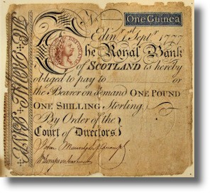 The bank note illustrated here was issued by the Royal Bank of Scotland (founded in 1727 by Royal Charter and derived from a society set up to manage the funds allocated by the Act of Union to compensate subscribers in the disastrous Darien Scheme). The value is "one guinea" or 1.05 pounds sterling. This note was issued in 1777 and was the first bank note in the world to be printed in colour (King George III's head is printed in red).