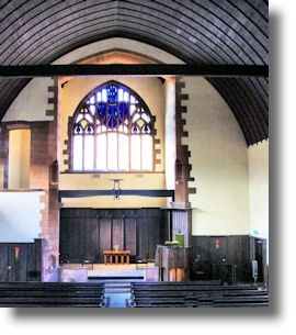 In addition to the main church, there is an adjoining church hall, also designed by Mackintosh. It is startling to find chairs designed by Mackintosh for the Willow Tearooms lining the walls - but these are replicas (originals are worth a small fortune).