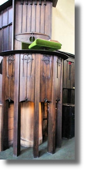 Mackintosh designs adorn the pulpit, the focal point of the church. The pulpit (see graphic on the left) rises high above the congregation and one motif (see picture on the right) is repeated five times round the front. It has been suggested that it represents a bird's wings embracing and protecting young plant shoots; perhaps these are the seed which was sown on fertile ground? Echoes of the parable of the sower, which comes from St Matthew's gospel, abound in the church - at one stage the church was going to be called St Mathews and Mackintosh may have been responding to this.