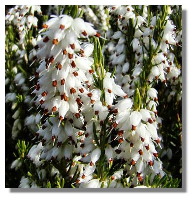 This is one of the 50,000 plants representing 900 varieties of heather at the Bell's Heather Garden. It is named "White Perfection". The six acre garden garden houses Europe's largest collection of heathers