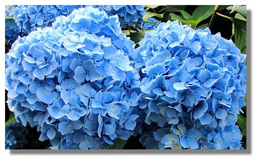The colour of the flowers on the large mop-head Hydrangeas is determined by the acidity of the soil. Intense blue ones like these are produced on acid soil but the same type of plant can produce pink flowers on neutral or alkaline soils. Red blooms are produced on strongly alkaline soil.