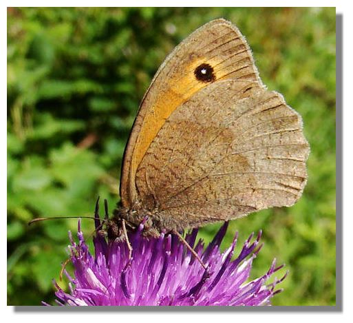 Meadow Brown butterflies are not as brightly coloured as Red Admirals. But in close up, the subtle shades of brown and orange are most attractive. The one here is feeding on a Knapweed flower, which looks a bit like a thistle - but without the sharp spikes.