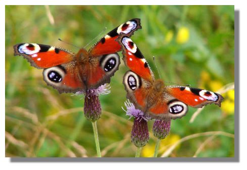 Increasing numbers of Peacock butterflies this month meant that I was able to get this picture of two of them, side by side, as they fed on the remaining thistles.