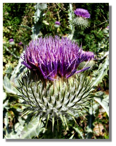 The giant thistle "Onopordum" can grow to eight feet high and creates a dramatic show at the back of a large border, with its silver leaves and large purple flowers. Because of its size, it is not often seen in suburban gardens but is popular in places like the walled garden in Culzean Castle Country Park (as here) or Princes Street Gardens below Edinburgh Castle.
