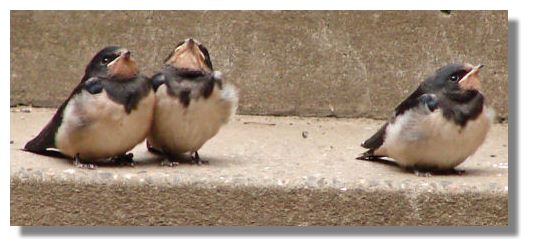 This picture is of the same young swallows as in the illustration above. But this time they are waiting expectantly on the steps leading from the underpass. I tried to get a photo of the parents actually feeding them, but they sped in and out so fast that all I got was a blur of wings!