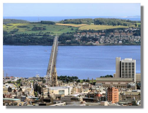 This is the view from the top of Dundee Law (570 feet above sea level) in the centre of Dundee, looking south to the Tay Road Bridge and Fife on the other side of the river. The road bridge was built in 1966 at a cost of £6 million, avoiding a 50 mile journey between Dundee and Newport on Tay on the other side (or the ferry that was made redundant by the bridge). 1.4 miles long, the Tay Road Bridge carries over 8 million vehicles a year.
